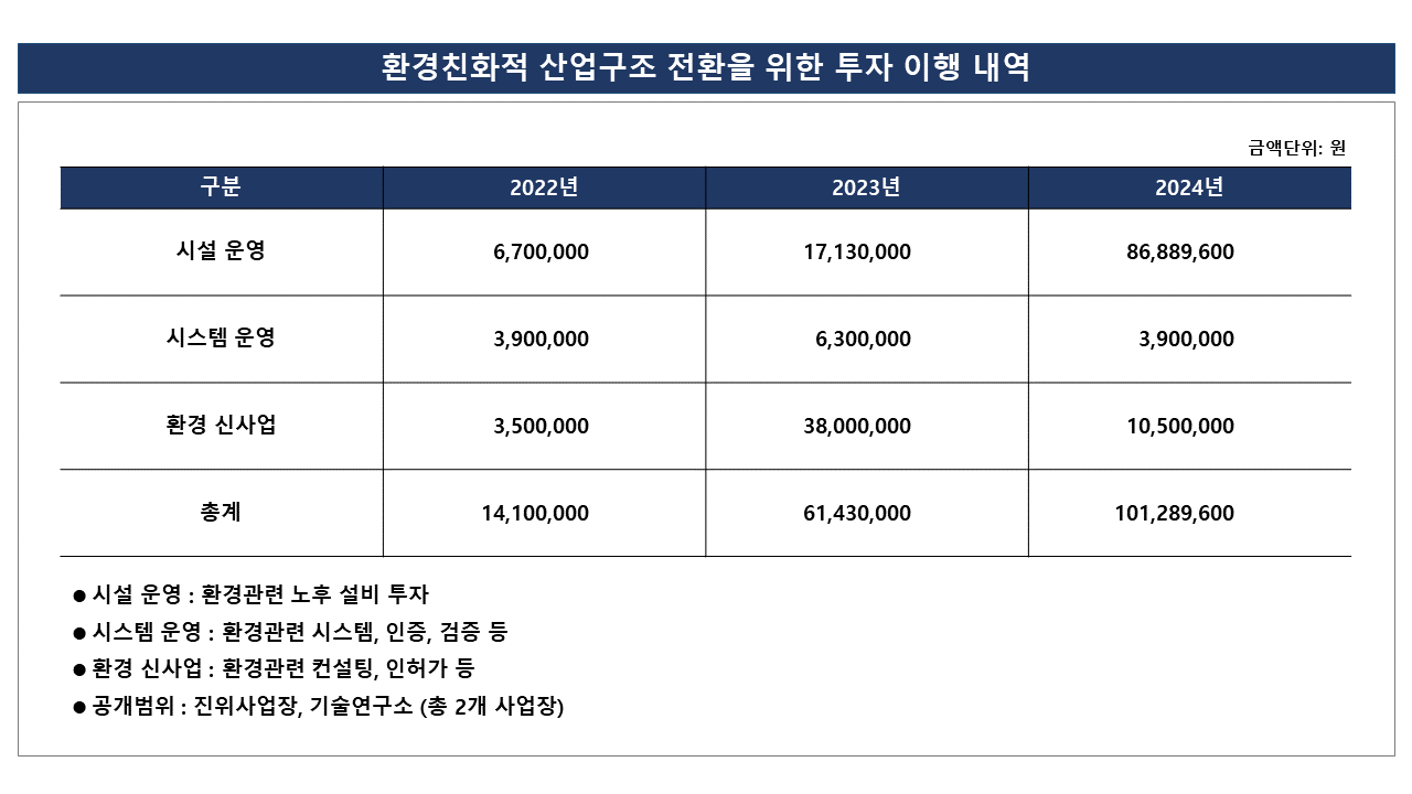 환경친화적 산업구조로 전환하기 위한 투자이행 내역